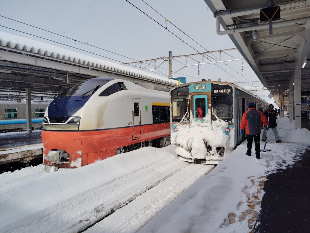 特急スーパーつがる(E751系)と青い森鉄道線(青い森701系)の並び